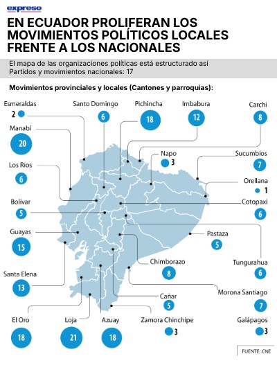 El mapa de las organizaciones políticas está estructurado así Partidos y movimientos nacionales: 17 Movimientos provinciales y locales (Cantones y parroquias):