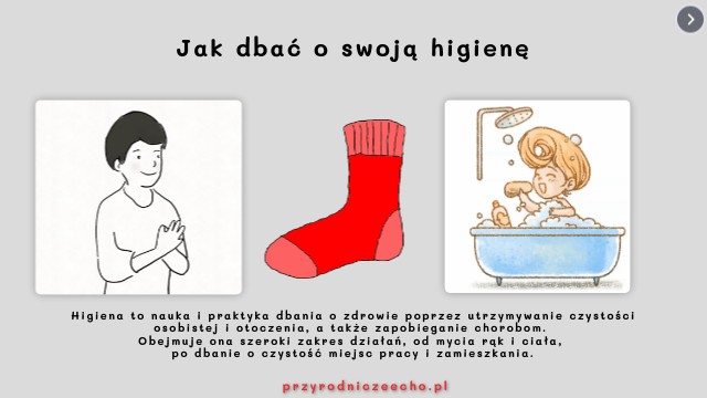 Zadanie: w grupach sortują obrazki na dwie kategorie: 🧼 „Zachowania higieniczne” 😬 „Zachowania niehigieniczne” Potem krótka prezentacja i omówienie, dlaczego niektóre rzeczy są szkodliwe.