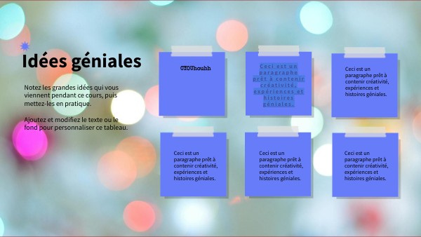 Notez les grandes idées qui vous viennent pendant ce cours, puis mettez-les en pratique. Ajoutez et modifiez le texte ou le fond pour personnaliser ce tableau.
