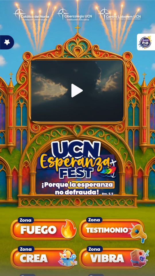 ZONA FUEGO: “Donde la esperanza arde”. Será un espacio para la oración, la interiorización y el encuentro con Dios que alimenta la esperanza. ZONA TESTIMONIO: “Lo que otros vivieron puede ayudarte” Será un espacio para que veas, escuches y aprendas de personas que han superado situaciones difíciles con fe, resiliencia y esperanza. ZONA CREA: “Donde la esperanza se vuelve imagen, sonido y color”. Será el espacio para darle color a la esperanza a través del arte, el diseño, la expresión visual o muestra artística en general. ZONA VIBRA: “Aquí se canta y se baila” Será el espacio a través de la música que transmite esperanza y alegría. ZONA CALMA: “Donde el alma respira” Será el espacio de silencio, de respiración profunda y de reflexión que te permitirá encontrar paz y esperanza. ZONA MISIÓN: “La esperanza es para compartirla” Será el espacio donde se comparten experiencias que siembran esperanza, además de llevar el compromiso de esperanza a todos los lugares.