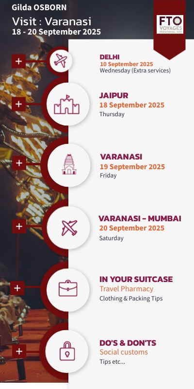 05H30: GUIDE REPORTING TIME Pickup place: BrijRama Palace, Darbhanga GhatDriver: Mr. Jitender K. Pathak Telephone: + 91 95535 07140 Guide : Mr. Pawan Kumar Telephone: + 91 99362 76622 DAY TRIP VARANASI – THE HOLY CITY EXPERIENCE At 5:30 am, you will take a boat ride on the sacred Ganges, witnessing the city awaken along its ghats. This will be followed by a guided walk through the lanes of the Old City with visits to the Shree Kashi Vishwanath Temple, Annapurna Temple, and Vishalakshi Temple. You will enjoy a traditional Thali lunch at a local restaurant. Afterwards, you may return to your hotel to rest if needed. In the afternoon, you will continue to the historic ruins of Sarnath, where Buddha delivered his first sermon, along with nearby temples. Later in the evening, you will walk through the vibrant Godowlia market area before attending the Ganga Aarti ceremony on the ghats, a highlight of your stay in Varanasi. After the ceremony, you will be transferred back to your hotel.