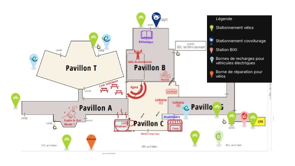Légende Stationnement vélos Stationnement covoiturage Station BIXI Bornes de recharges pour véhicules électriques Borne de réparation pour vélos