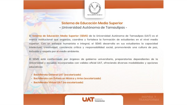 El Sistema de Educación Media Superior (SEMS) de la Universidad Autónoma de Tamaulipas (UAT) es el marco institucional que organiza, coordina y fortalece la formación de estudiantes en el nivel medio superior. Con un enfoque humanista e integral, el SEMS desarrolla en sus estudiantes la capacidad intelectual, creatividad, conciencia crítica y responsabilidad social, promoviendo una cultura de paz, inclusión y respeto por el medio ambiente. El SEMS está conformado por órganos de gobierno universitario, preparatorias dependientes de la Universidad y escuelas incorporadas con validez oficial UAT, ofreciendo diversas modalidades y opciones educativas: