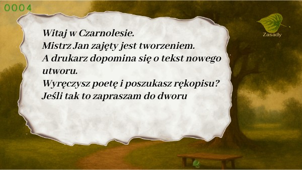 Witaj w Czarnolesie. Mistrz Jan zajęty jest tworzeniem. A drukarz dopomina się o tekst nowego utworu. Wyręczysz poetę i poszukasz rękopisu? Jeśli tak to zapraszam do dworu