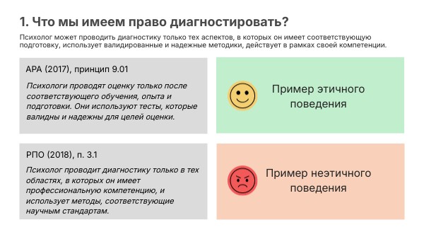 Психолог проводит диагностику только в тех областях, в которых он имеет профессиональную компетенцию, и использует методы, соответствующие научным стандартам.
