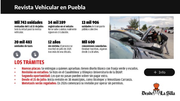 Unidades revisadas hasta el momento: 5 mil 350 vehículos (15.35% del padrón total) Unidades revisadas en Puebla capital: 2 mil 519 vehículos (aproximadamente 47% del total revisado) Porcentaje de unidades que cumplían con todos los requisitos en primeras semanas: Alrededor del 50%