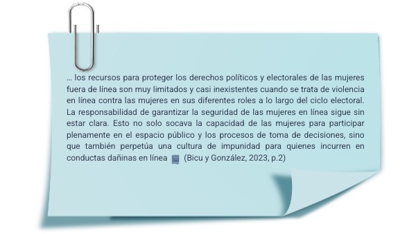 … los recursos para proteger los derechos políticos y electorales de las mujeres fuera de línea son muy limitados y casi inexistentes cuando se trata de violencia en línea contra las mujeres en sus diferentes roles a lo largo del ciclo electoral. La responsabilidad de garantizar la seguridad de las mujeres en línea sigue sin estar clara. Esto no solo socava la capacidad de las mujeres para participar plenamente en el espacio público y los procesos de toma de decisiones, sino que también perpetúa una cultura de impunidad para quienes incurren en conductas dañinas en línea (Bicu y González, 2023, p.2)