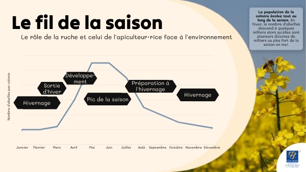 La population de la colonie évolue tout au long de la saison. En hiver, le nombre d'abeilles descend à quelques milliers alors qu'elles sont plusieurs dizaines de milliers au plus fort de la saison en mai.