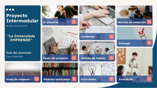El proyecto intermodular de dirección de cocina (PIDC) consiste en la realización de un trabajo con carácter integrador y complementario de los conocimientos incorporados en los módulos profesionales que configuran el ciclo formativo del Técnico Superior en Dirección de Cocina. La finalidad de este proyecto es integrar las competencias adquiridas en el resto de módulos, con especial atención a los elementos de búsqueda de información, innovación, investigación aplicada y emprendimiento, vinculados a los resultados de aprendizaje en función de las características del sector de Hostelería. Durante el desarrollo del proyecto intermodular, existirá un seguimiento y tutorización individual y colectiva del proyecto, que se desarrollará de manera simultánea al resto de los módulos profesionales y bajo la supervisión del profesor asignado.