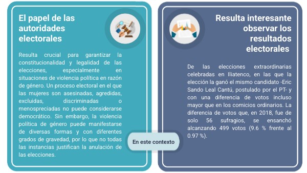 Resulta crucial para garantizar la constitucionalidad y legalidad de las elecciones, especialmente en situaciones de violencia política en razón de género. Un proceso electoral en el que las mujeres son asesinadas, agredidas, excluidas, discriminadas o menospreciadas no puede considerarse democrático. Sin embargo, la violencia política de género puede manifestarse de diversas formas y con diferentes grados de gravedad, por lo que no todas las instancias justifican la anulación de las elecciones.