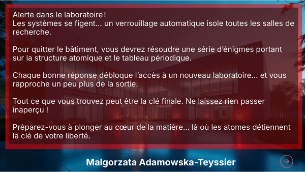 Alerte dans le laboratoire !Les systèmes se figent… un verrouillage automatique isole toutes les salles de recherche. Pour quitter le bâtiment, vous devrez résoudre une série d’énigmes portant sur la structure atomique et le tableau périodique. Chaque bonne réponse débloque l’accès à un nouveau laboratoire… et vous rapproche un peu plus de la sortie. Tout ce que vous trouvez peut être la clé finale. Ne laissez rien passer inaperçu ! Préparez-vous à plonger au cœur de la matière… là où les atomes détiennent la clé de votre liberté.