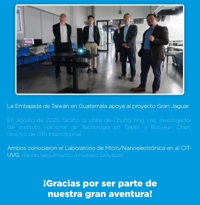 La Embajada de Taiwán en Guatemala apoya al proyecto Gran Jaguar. En agosto de 2025, facilitó la visita de Chung-Ying Lee, investigador del Instituto Nacional de Tecnología en Taipei, y BoGaun Chen, director de ITRI International. Ambos conocieron el Laboratorio de Micro/Nanoelectrónica en el CIT-UVG, dando seguimiento a nuestro proyecto.