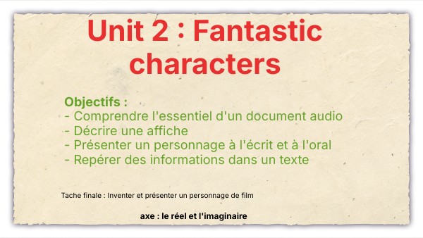 Objectifs : - Comprendre l'essentiel d'un document audio - Décrire une affiche - Présenter un personnage à l'écrit et à l'oral - Repérer des informations dans un texte