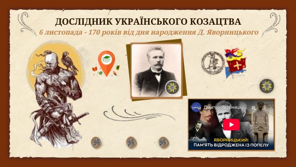 Внесок Дмитра Яворницького в історію України Дмитро Яворницький – видатний громадський діяч, історик, дослідник козаччини. Патріот, який віддано служив інтересам своєї Батьківщини. Учений зробив величезний внесок у розвиток української науки, освіти та соціальних інститутів. Завдяки Яворницькому світ побачив комплексне дослідження з історії українського запорозького козацтва. Цій тематиці він присвятив низку праць, але найголовніша з них – фундаментальна тритомна «Історія запорозьких козаків». На її сторінках висвітлено політичну, економічну, соціальну, культурну, духовну спадщину козацтва, побут, торгівлю, відносини із зовнішнім світом. Окремі роботи Дмитра Івановича присвячені діяльності Гетьмана Петра Конашевича-Сагайдачного, славетних запорозьких кошових отаманів Івана Сірка та Петра Калнишевського, отамана задунайського козацтва Йосипа Гладкого. Громадянська позиція Яворницького яскраво проявилася в його діяльності в освітянському русі, передусім у катеринославському товаристві «Просвіта», біля витоків якого він стояв у 1905 році. У післяреволюційні часи, в умовах страшної розрухи, паперового голоду в країні, безгрошів'я і повної байдужості місцевого начальства до архівної справи, Дмитро Яворницький доклав багато зусиль для врятування цінних історичних джерел. Своєю працею вчений довів, що українська історія – надзвичайно багата, а український народ має давнє коріння.