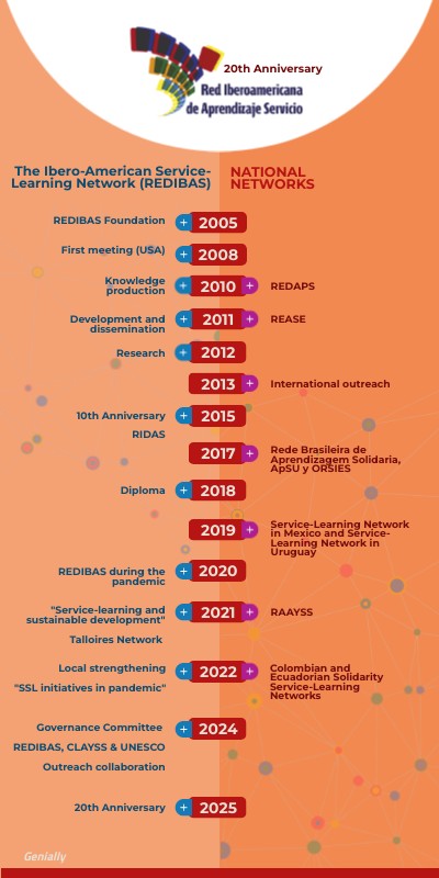 Creation of the Rede Brasileira de Aprendizagem Solidaria, Brazil, and ORSIES (Observatory of Social Responsibility and Higher Education Institutions, Portugal). The Spanish University Service-Learning Association is established.