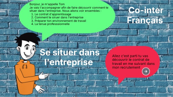 Bonjour, je m'appelle Tom Je vais t'accompagner afin de faire découvrir comment te situer dans l'entreprise. Nous allons voir ensembles : - Le contrat d'apprentissage