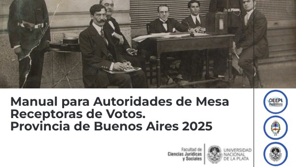 El Observatorio de Estudios Electorales y Político Institucionales (OEEPI) de la Facultad de Ciencias Jurídicas y Sociales de la Universidad Nacional de La Plata se enorgullece en presentar el Primer Manual para Autoridades de Mesas Receptoras de Votos interactivo. Este manual está dirigido además de a las autoridades de mesa designadas para la elección del próximo 7 de septiembre, para los/as bonaerenses, a las y los fiscales, apoderados/as de agrupaciones políticas, Jueces y Juezas de Paz y Jueces y Juezas en lo Civil y Comercial en turno el día del comicio. El objetivo principal de este manual es capacitar a quienes ejerzan la función de Presidente/a o Suplente de Mesa, ofreciéndoles la normativa electoral provincial necesaria. Sin embargo, su propósito va más allá: busca educar cívicamente a todas y todos los bonaerenses en sus derechos y obligaciones como electorado activo y pasivo. La última parte del manual es una herramienta práctica y completa, diseñada para ayudar a resolver dudas y acceder a información clave. Respuestas a preguntas frecuentes: una sección de guía rápida para resolver tus dudas al instante. Validación de conocimientos: ejercicios prácticos para reforzar lo aprendido y asegurarte de estar preparado. Además encontrarán un enlace a un sitio de asesoramiento en el que podrán consultar toda la información de las elecciones del 7 de septiembre en un solo lugar: podrán encontrar los datos de la justicia electoral, que incluye direcciones y teléfonos, para saber a quién acudir en caso de necesidad; datos claves de los 135 municipios: número de votantes, mesas, centros de votación y la composición de los Concejos Deliberantes y Consejos Escolares; detalles de las autoridades locales; nombre y apellido de los/as intendentes de cada municipio y su antigüedad en el cargo. Esta herramienta está diseñada para que cumplas tu rol de la mejor manera.Prof. Sebastián López Calendino Sub Director del OEEPI