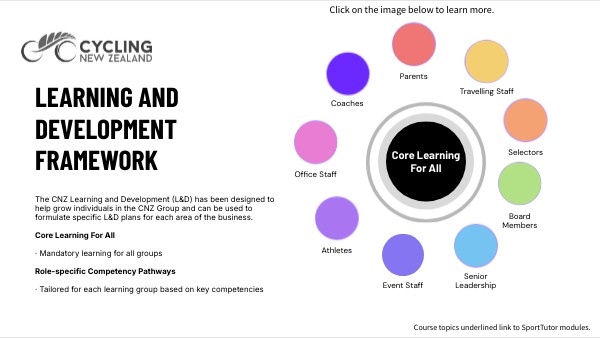 - Intro to CNZ & Values- Integrity in Sport - Creating a positive Cycling culture - Unconscious Bias - Mental Health - Creating an Athlete Centred sporting environment - Responding to harm or complaints - Diversity, inclusion & belonging - Safeguarding & Child Protection