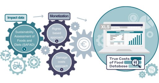 For the impacts considered in the True Costs of Food Database, restoration costs are applied to GHG emissions, eutrophication, and water consumption, while compensation costs are applied to human health and ecotoxicity impacts.