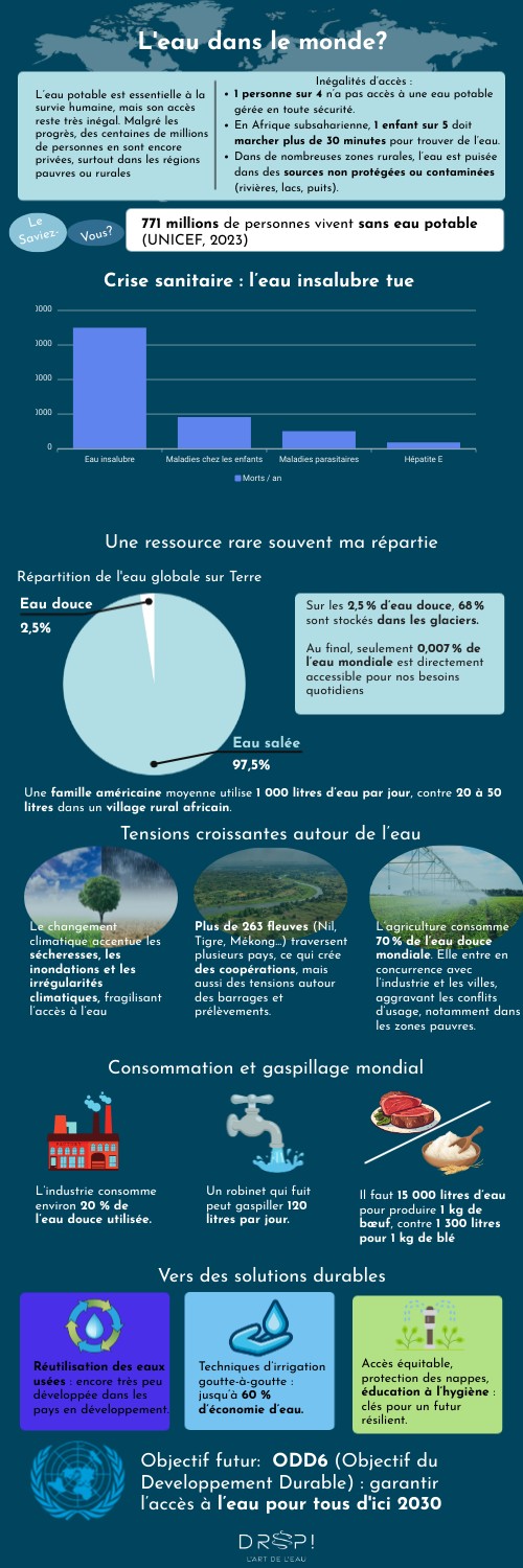 L’eau potable est essentielle à la survie humaine, mais son accès reste très inégal. Malgré les progrès, des centaines de millions de personnes en sont encore privées, surtout dans les régions pauvres ou rurales