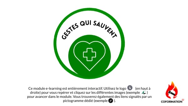 Ce module e-learning est entièrement interactif. Utilisez le logo (en haut à droite) pour vous repérer et cliquez sur les différentes images (exemple ) pour avancer dans le module. Vous trouverez également des liens signalés par un pictogramme dédié (exemple ).