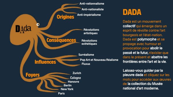 Dada est un mouvement collectif qui émerge dans un esprit de révolte contre l'art bourgeois et l'état-nation. Dada est polymorphe et se propage avec humour et provocation pour abolir le passé et le futur, n'exister que dans le présent et abattre les frontières entre l'art et la vie. Laissez-vous guider par la pieuvre dada et cliquez sur les mots pour accéder aux œuvres de la collection du Musée national d'art moderne.