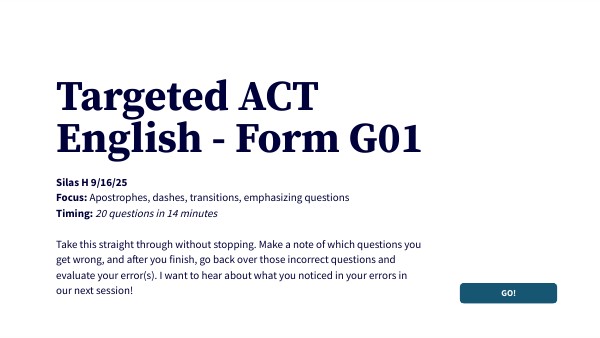 Silas H 9/16/25 Focus: Apostrophes, dashes, transitions, emphasizing questions Timing: 20 questions in 14 minutes Take this straight through without stopping. Make a note of which questions you get wrong, and after you finish, go back over those incorrect questions and evaluate your error(s). I want to hear about what you noticed in your errors in our next session!
