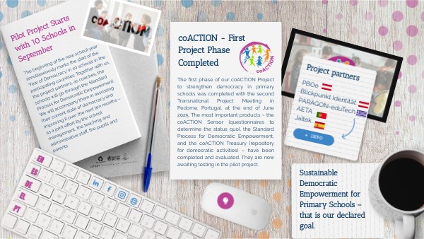 Η πρώτη φάση του έργου coACTION, για την ενίσχυση της δημοκρατίας στα δημοτικά σχολεία, ολοκληρώθηκε με τη δεύτερη διακρατική συνάντηση των εταίρων, στο Pedome της Πορτογαλίας, στα τέλη Ιουνίου 2025. Τα πιο σημαντικά αποτελέσματα – ο αισθητήρας coACTION (ερωτηματολόγια για τον προσδιορισμό της υφιστάμενης κατάστασης), η τυποποιημένη διαδικασία για την ενδυνάμωση της δημοκρατίας και το αρχείο coACTION (αποθήκη δημοκρατικών δραστηριοτήτων) – έχουν ολοκληρωθεί και αξιολογηθεί. Τώρα αναμένεται η δοκιμή τους στο πλαίσιο της πιλοτικής εφαρμογής.