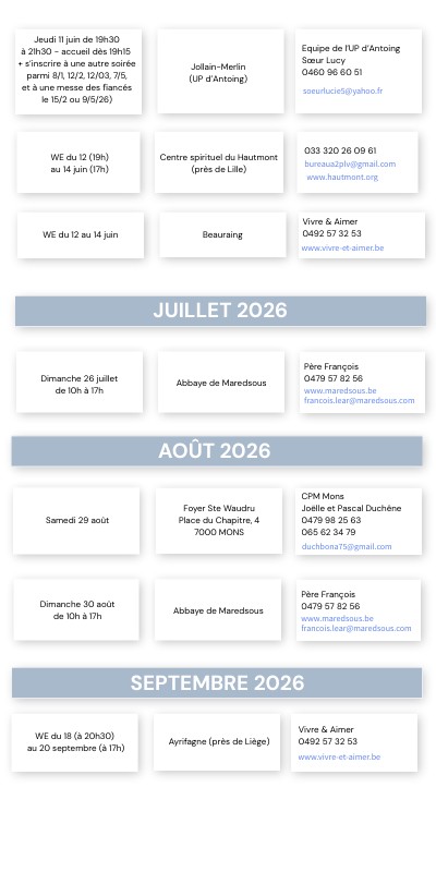 Jeudi 11 juin de 19h30 à 21h30 - accueil dès 19h15 + s’inscrire à une autre soirée parmi 8/1, 12/2, 12/03, 7/5,et à une messe des fiancés le 15/2 ou 9/5/26)