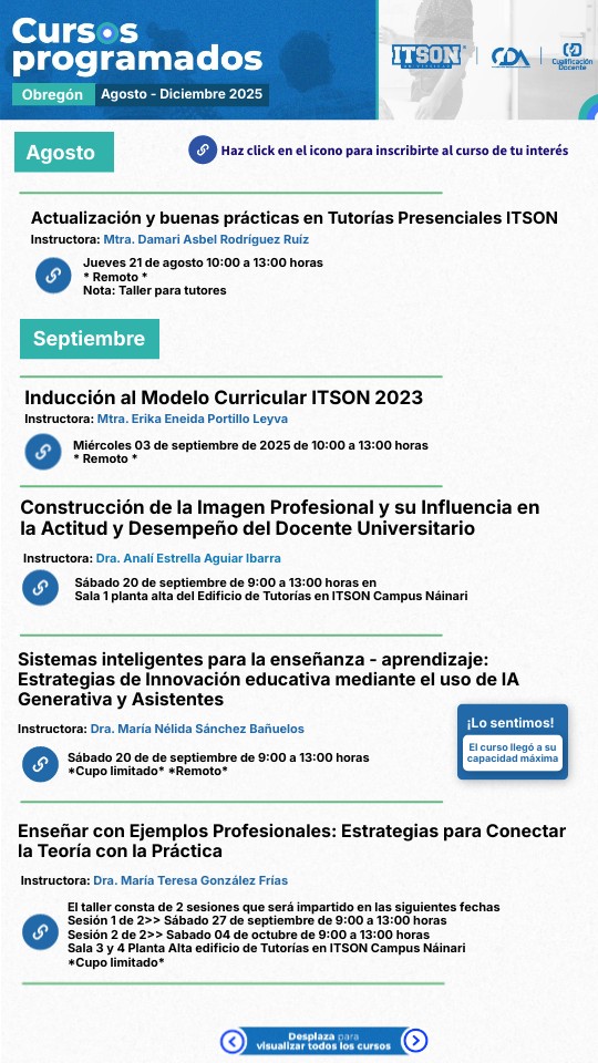 Sábado 04 de octubre de 9:00 a 13:00 horas Salas 1 y 2 planta alta del edifico de tutorias ITSON Campus Náinari*Cupo limitado*