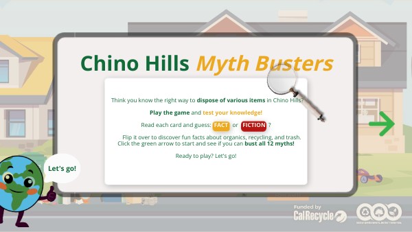 Think you know the right way to dispose of various items in Chino Hills? Play the game and test your knowledge! Read each card and guess: FACT or FICTION ? Flip it over to discover fun facts about organics, recycling, and trash. Click the green arrow to start and see if you can bust all 12 myths! Ready to play? Let's go!