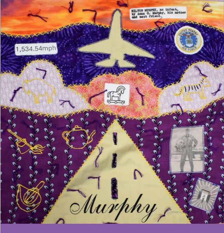 According to his obituary, Hilton was “the first African-American military pilot to fly MACH II (twice the speed of sound) in the F106, Phase III, at Edwards AFB commanded by Col. Chuck Yeager.” The F106 “Delta Dart” took its first flight in 1956 and was retired to the Air Force Museum in 1986. This number, 1.534.54, symbolizes the miles per hour considered Mach II speed. Hilton’s remarkable contribution to Air Force history is widely represented on the quilt.