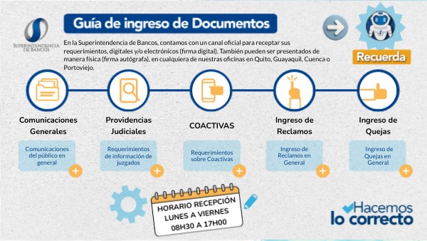 En la Superintendencia de Bancos, contamos con un canal oficial para receptar sus requerimientos, digitales y/o electrónicos (firma digital). También pueden ser presentados de manera física (firma autógrafa), en cualquiera de nuestras oficinas en Quito, Guayaquil, Cuenca o Portoviejo.