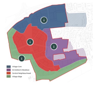 Located to the northeast of the scheme, the village core delivers a mix of uses, including the village centre that will provide a central facility for new and existing villagers, a new primary school, shops and residential properties built to a maximum height of three storeys.