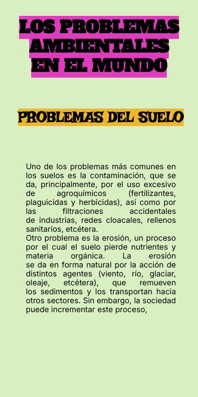 Uno de los problemas más comunes en los suelos es la contaminación, que se da, principalmente, por el uso excesivo de agroquímicos (fertilizantes, plaguicidas y herbicidas), así como por las filtraciones accidentales de industrias, redes cloacales, rellenos sanitarios, etcétera. Otro problema es la erosión, un proceso por el cual el suelo pierde nutrientes y materia orgánica. La erosión se da en forma natural por la acción de distintos agentes (viento, río, glaciar, oleaje, etcétera), que remueven los sedimentos y los transportan hacia otros sectores. Sin embargo, la sociedad puede incrementar este proceso,