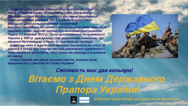 Щиро вітаємо з Днем Державного Прапора України! Це свято ми відзначаємо 23 серпня. Історія Державного Прапора налічує багато століть і є частиною української культури з сивої давнини. Ще з часів Київської Русі й козацької доби кольори жовтий і блакитний використовувались на гербах і прапорах козацьких земель. А офіційно синьо-жовтий прапор був визнаний Центральною Радою 22 березня 1922 р. Після проголошення Незалежності України у 1991 р. цей прапор став державним символом, що поєднує багатовікову історію та прагення до свободи. Блакитне небо й жовти поля пшениці поєналися на стягу. Зі зброєю в руках відстоюємо ми свій державний суверенітет і територіальну цілістність, своє право на свободу й існування як народ. Слава Героям, які ціною власного життя, власної крові боронять нас у лихоляття! Слава України!