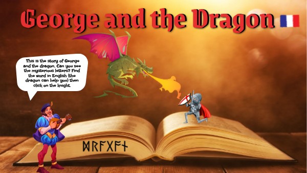 This is the story of George and the dragon. Can you see the mysterious letters? Find the word in English (the dragon can help you) then click on the knight.