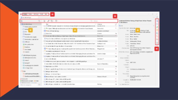 Le panneau central affiche toutes les références enregistrées dans un dossier. Naviguez dans les dossiers à gauche pour faire apparaitre au centre vos références. "Ma bibliothèque" affiche toutes les références que vous avez enregistrées dans Zotero !