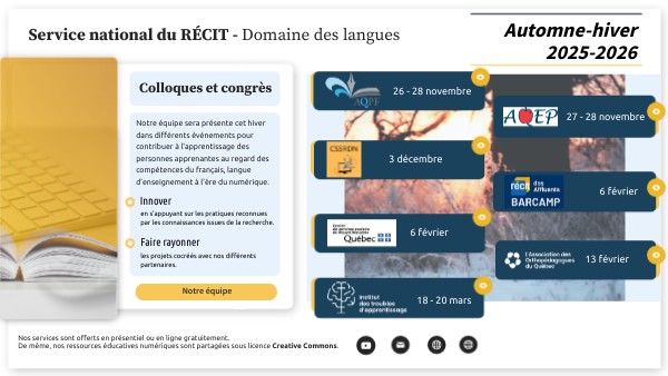Notre équipe sera présente cet hiver dans différents événements pour contribuer à l'apprentissage des personnes apprenantes au regard des compétences du français, langue d’enseignement à l’ère du numérique.