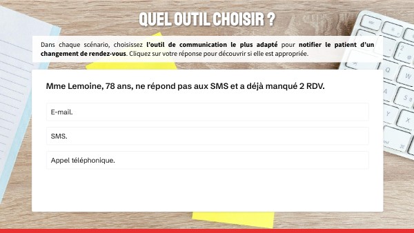 Dans chaque scénario, choisissez l’outil de communication le plus adapté pour notifier le patient d’un changement de rendez-vous. Cliquez sur votre réponse pour découvrir si elle est appropriée.