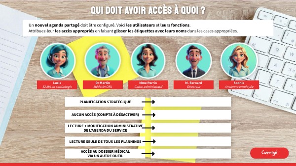 ✅Lucie : Accès limité à son service = moindre privilège. ✅Dr Martin : L’agenda sert à organiser les RDV, pas à stocker les infos médicales → accès clinique via outil dédié. ✅Mme Perrin : Rôle organisationnel → vision globale mais pas de données sensibles. ✅M. Bernard : Accès stratégique, pas aux détails patients. ✅Sophie : RGPD oblige à retirer les comptes inactifs.