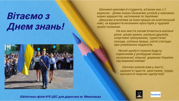 Шановні школярі й студенти, вітаємо вас з 1 вересня - Днем знань! Бажаємо успіхів у навчанні, нових відкриттів, натхнення та терпіння. Дякуємо вчителям за їхню працю на освітянській ниві, за відкриття незнаних просторів у чудовій країні пізнання.