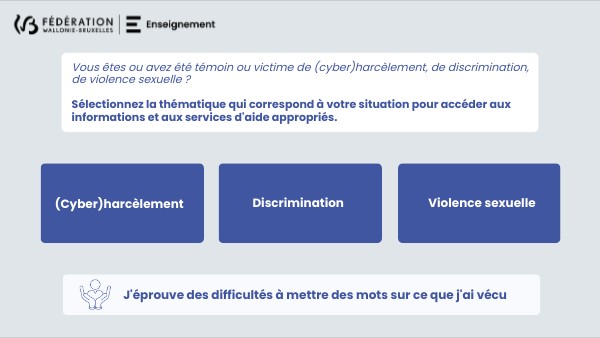 Vous êtes ou avez été témoin ou victime de (cyber)harcèlement, de discrimination, de violence sexuelle ? Sélectionnez la thématique qui correspond à votre situation pour accéder aux informations et aux services d'aide appropriés.