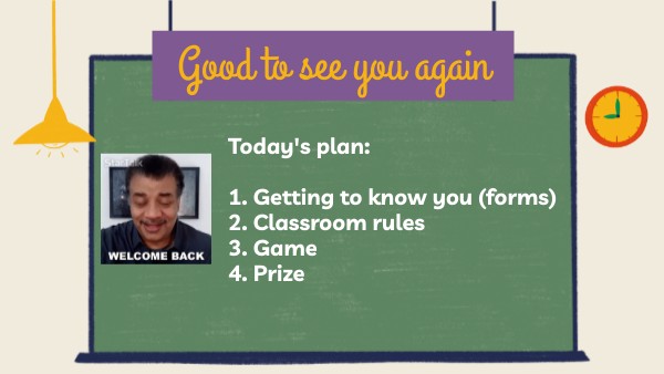 Today's plan: 1. Getting to know you (forms) 2. Classroom rules 3. Game 4. Prize