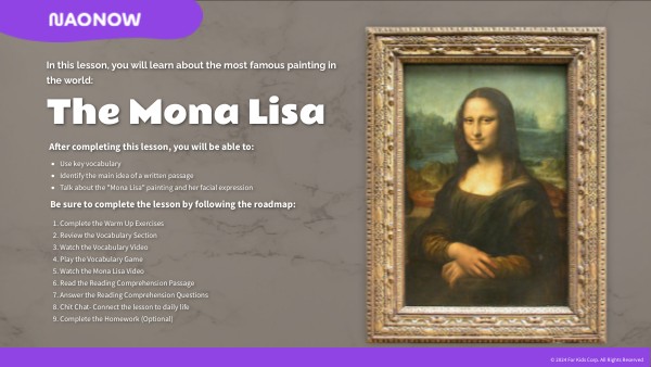 If you are ever lucky enough to go to the Louvre (a very large museum in Paris), make sure you don't miss seeing the Mona Lisa! The Mona Lisa is the most famous painting in the world. The Italian painter, Leonardo da Vinci, painted this portrait many years ago- between 1503 and 1506! The painting is a portrait of a woman who looks like she is smiling at you. The painting is famous because of its realistic portrayal of an actual person. Leonardo da Vinci achieved this result by using subtle changes of light and shadow. His painting is almost as realistic as a photograph obtained from an iPhone. You will surely be surprised at how small the painting is in real life!