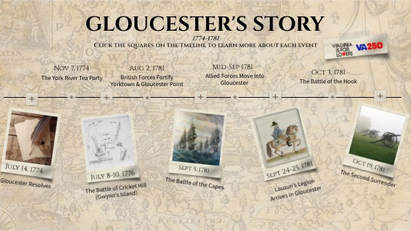 Gloucester County supported Virginia’s 1774 boycott of English goods and authorized its own tea party in the York River in solidarity. During the Yorktown Tea Party, Gloucester's committee of safety arrived too late to dump tea but endorsed the act, highlighting the county’s active Revolutionary stance across the river from Yorktown.