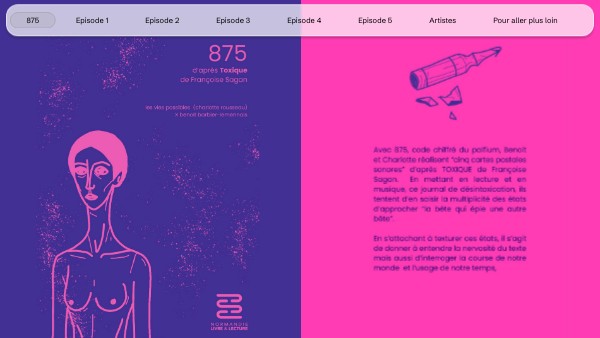 875 est une création artistique commandée par N2L dans le cadre de Normandie terre d'écriture pour célébrer l'anniversaire de Françoise Sagan