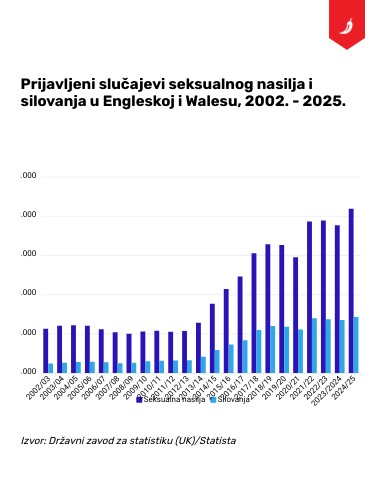 Prijavljeni slučajevi seksualnog nasilja i silovanja u Engleskoj i Walesu, 2002. - 2025.