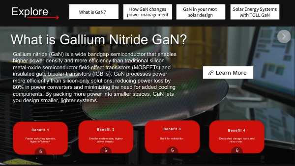 Gallium nitride (GaN) is a wide bandgap semiconductor that enables higher power density and more efficiency than traditional silicon metal-oxide semiconductor field-effect transistors (MOSFETs) and insulated gate bipolar transistors (IGBTs). GaN processes power more efficiently than silicon-only solutions, reducing power loss by 80% in power converters and minimizing the need for added cooling components. By packing more power into smaller spaces, GaN lets you design smaller, lighter systems.