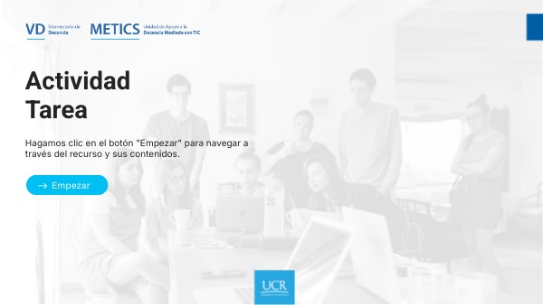 La actividad Tarea permite programar una asignación donde se espera una participación por parte de las personas estudiantes que será visualizada únicamente por la persona docente.La Tarea puede ser configurada para que dicha participación se haga de forma individual, en grupos o subgrupos. Puede tener distintas funcionalidades como: